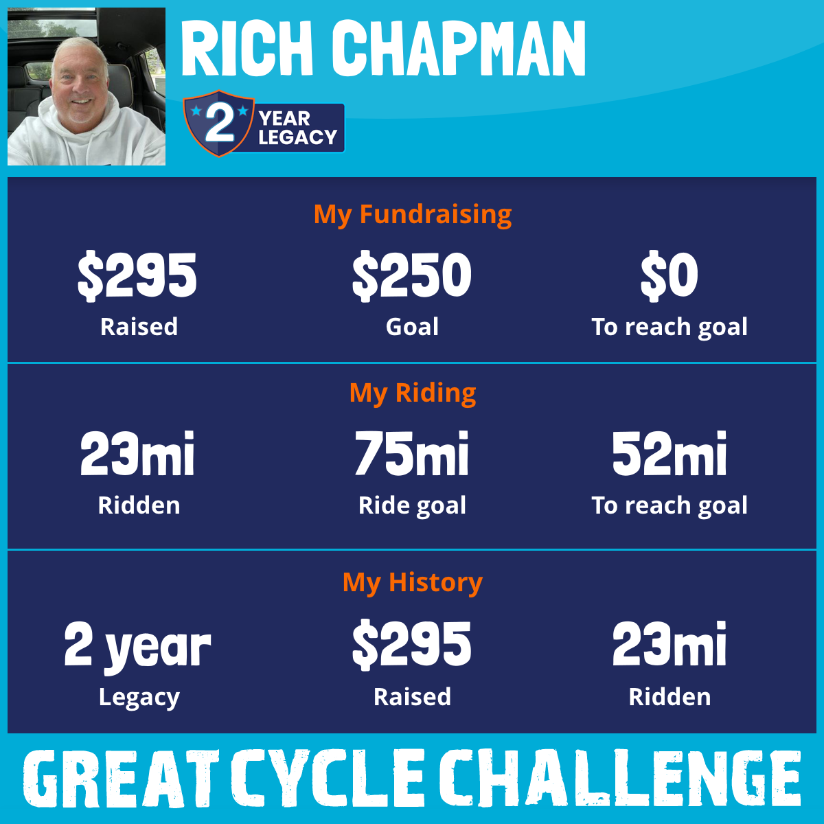 I am riding 75 mi in memory of my dad, Richard K Chapman. Please sponsor me and support my challenge to fight kids' cancer and save little lives.