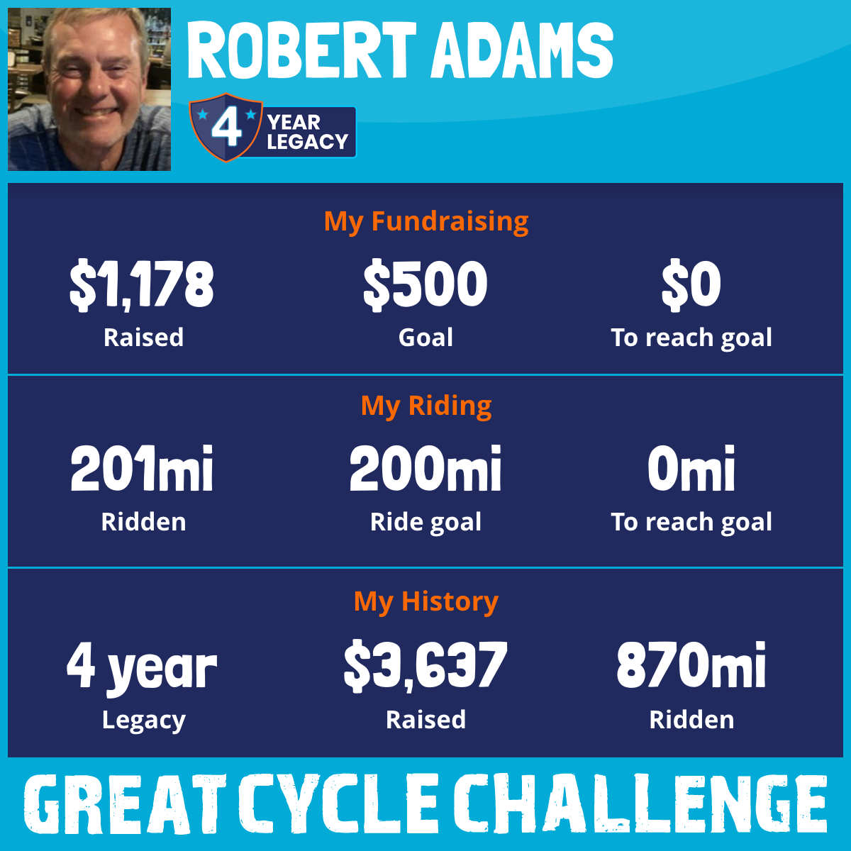 This September, I am taking part in the Great Cycle Challenge to fight kids' cancer! I am riding 200 mi in memory of my mom & dad Bob & Barbara Adams, who both had cancer. Please sponsor me and support my challenge to fight kids' cancer and save little lives.