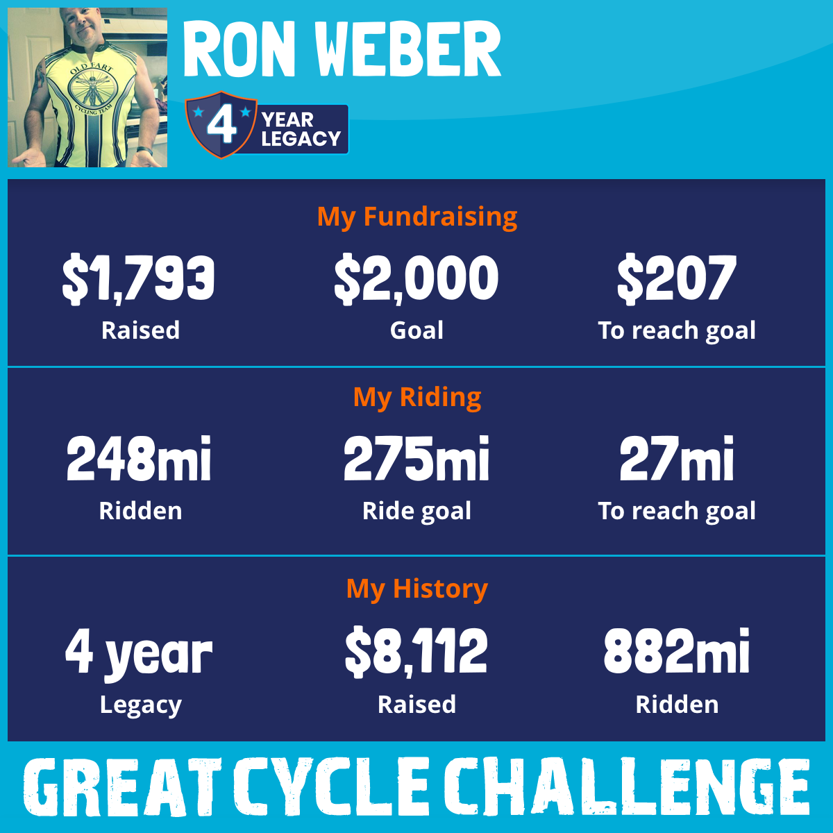 I am riding 275 mi in memory of Robert Weber (father). Please sponsor me and support my challenge to fight kids' cancer and save little lives.