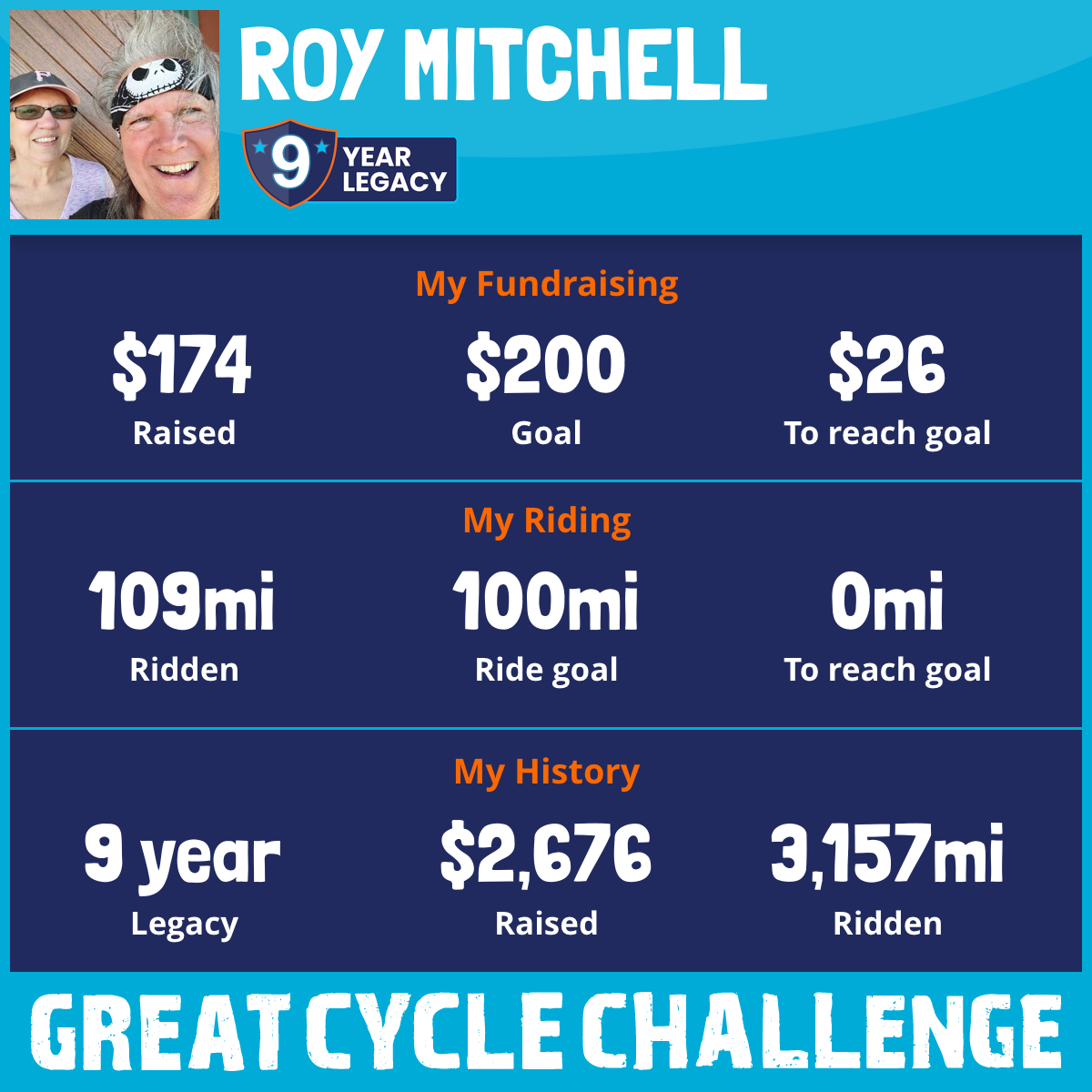 15 Sep 2025Due to some physical limitations, I am having touble riding this year. My great friend Cheri has offered to team up with me to achieve the goals.