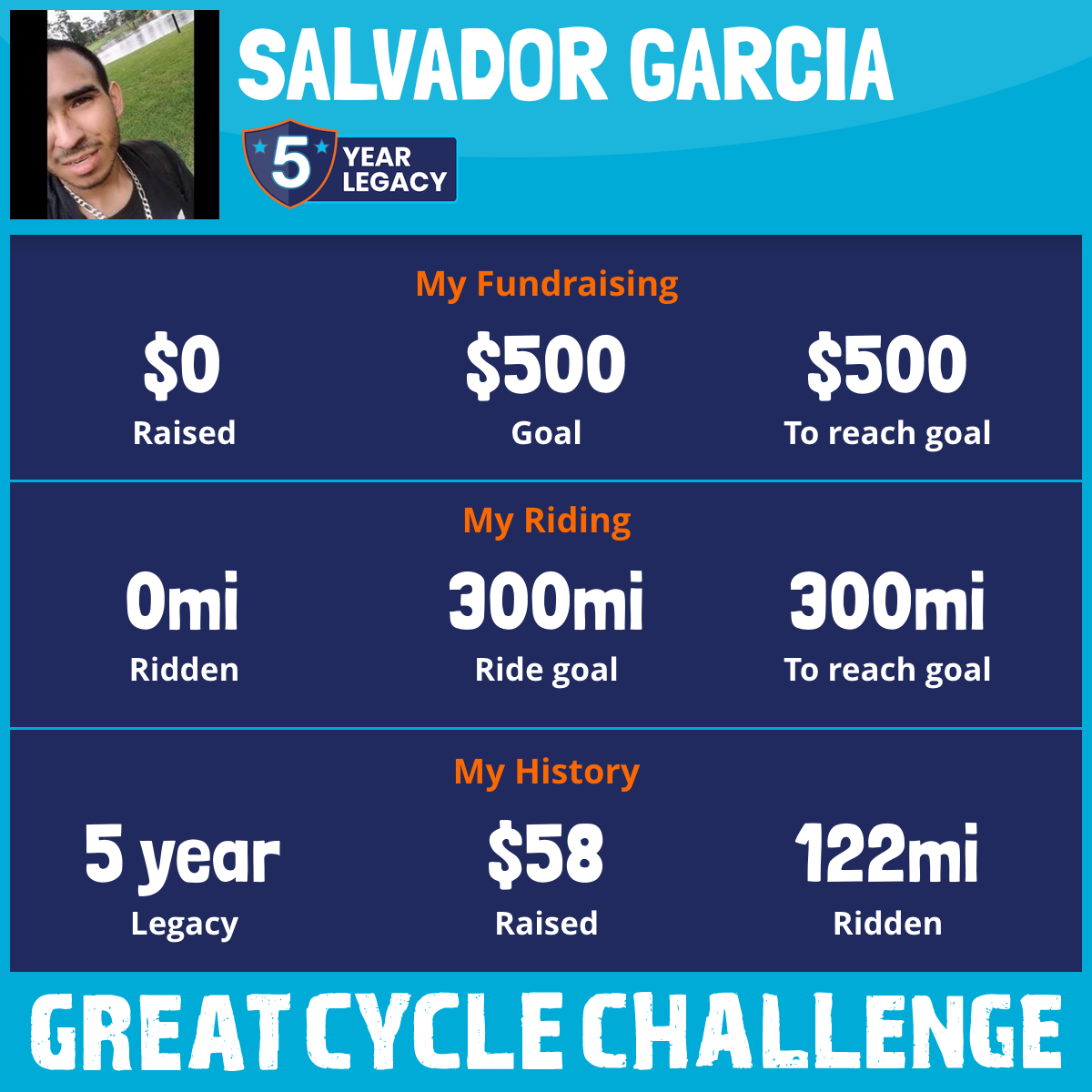 I've raised $0 My goal is $500 Donate Now