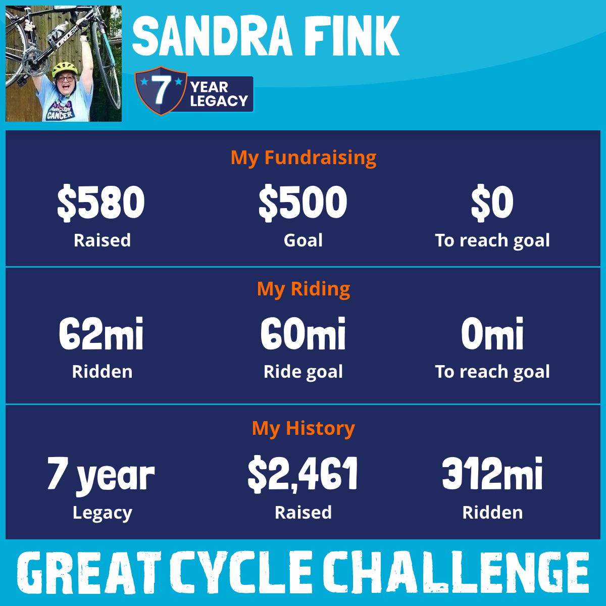 Hey everyone! Once again I've signed up for the 2025 Great Cycle Challenge and will be riding during the month of September to fight kids' cancer! My goal is to pedal at least 60 miles (for turning 60 this year :) and raise $500 or more.