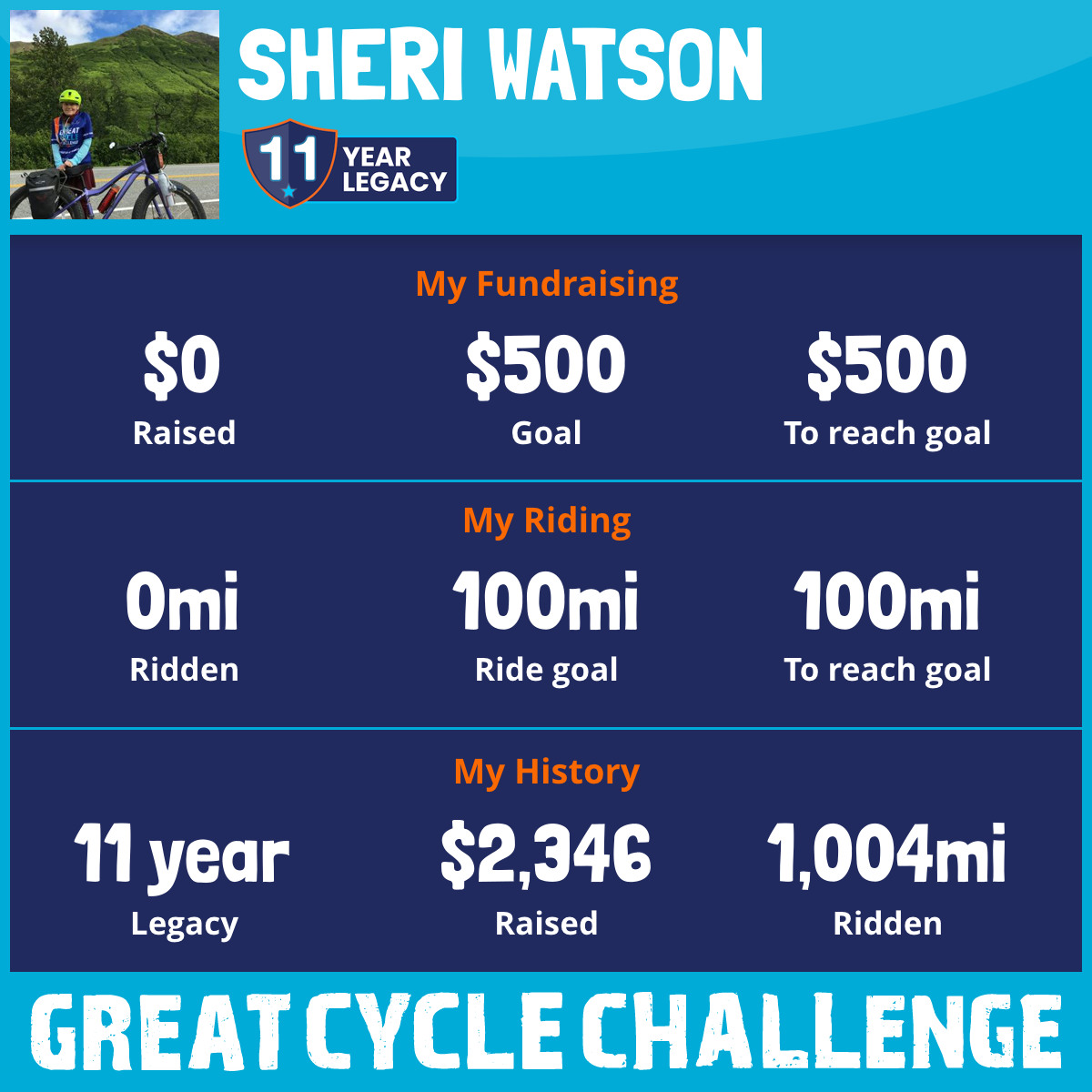 I am riding 100 mi in memory of Sheri Watson. Please sponsor me and support my challenge to fight kids' cancer and save little lives.
