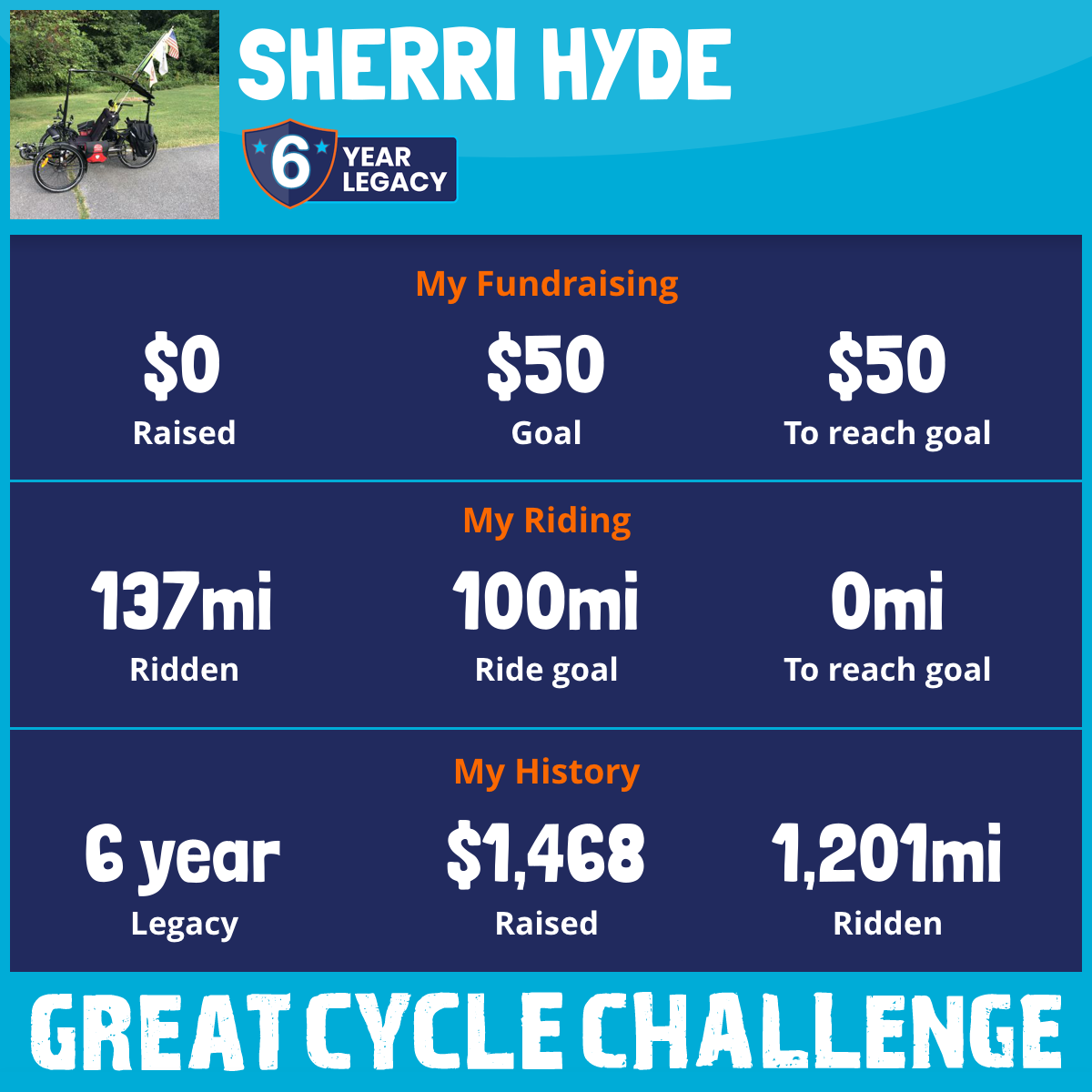 I’ve ridden overall 657 miles and raised $1,313 overall this will be my sixth year of riding in the challenge.