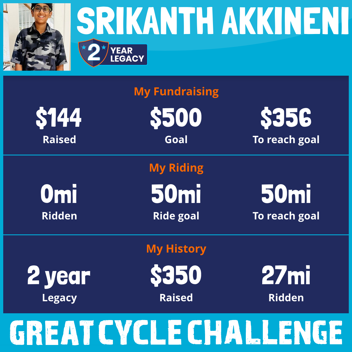 I've raised $144 My goal is $500 Donate Now