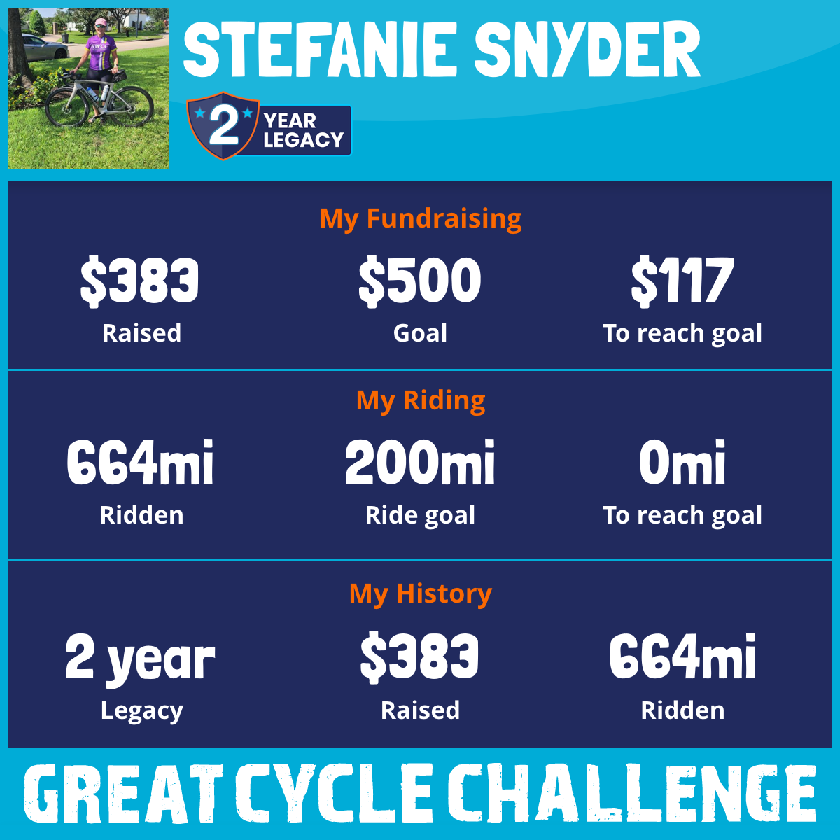 My goal this month was to cycle 200 miles and raise $500 in the Great Cycle Challenge which directly supports kids with cancer. On Saturday, I completed a 50 mile ride and have surpassed my goal. It is worth every minute of my time to help these kiddos.