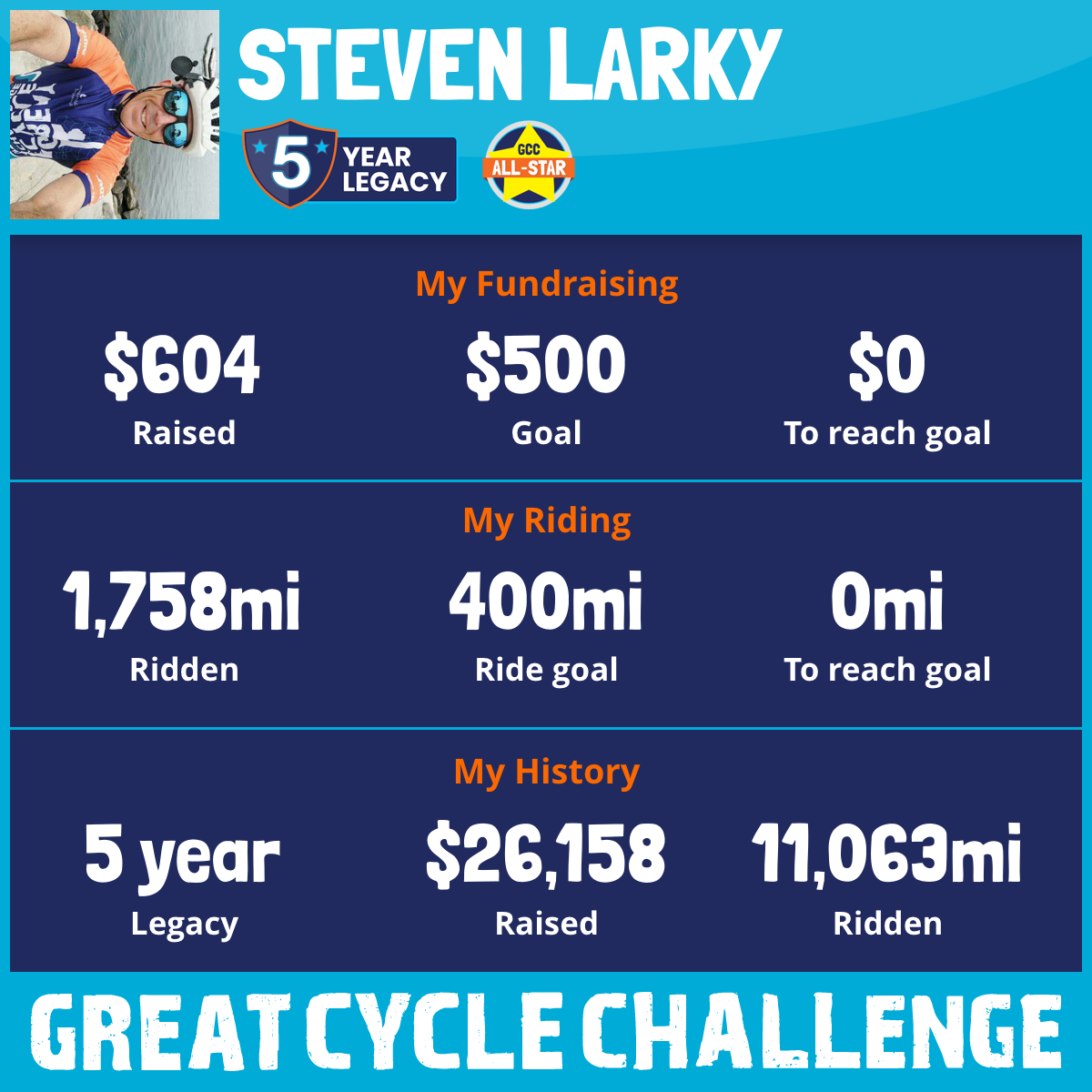 This is my fifth year biking in the Great Cycle Challenge to support research to end childhood cancer.