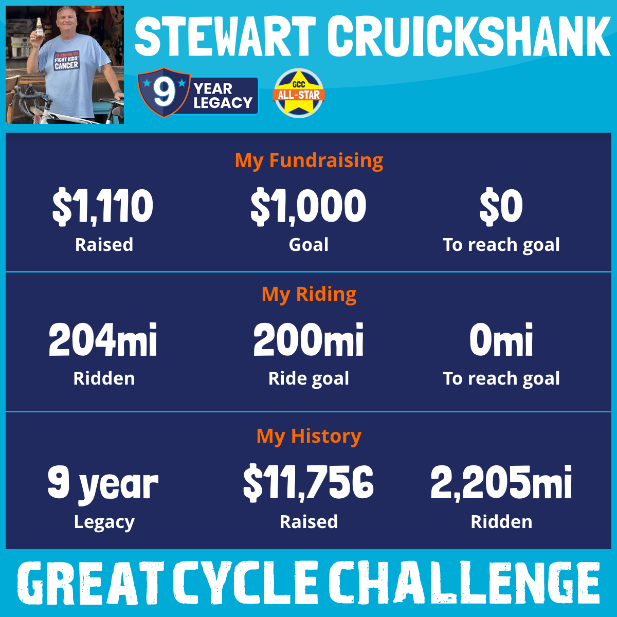 Because of you, I am close to raising $11,000 and over 2,000 miles. This September will be a little more challenging for me. I had foot surgery and I will gone for a big part of September but none of that compares to what the kids go through every day, so I will never complain.