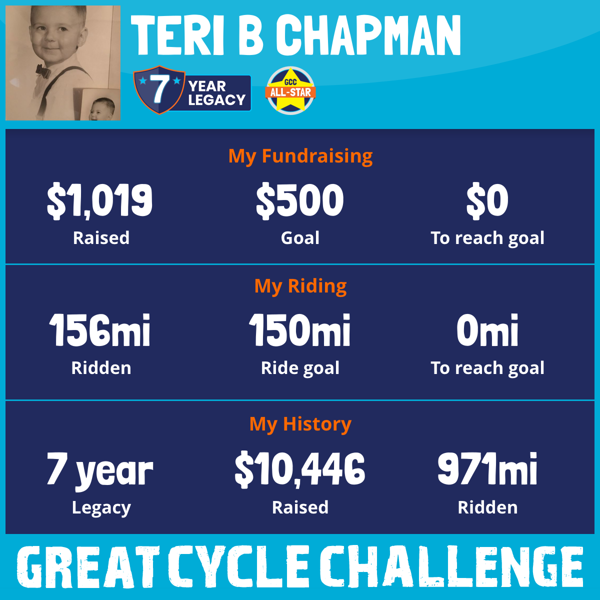 This September, I am taking part in the Great Cycle Challenge to fight kids' cancer! This will be my sixth year riding to kick children cancers butt!