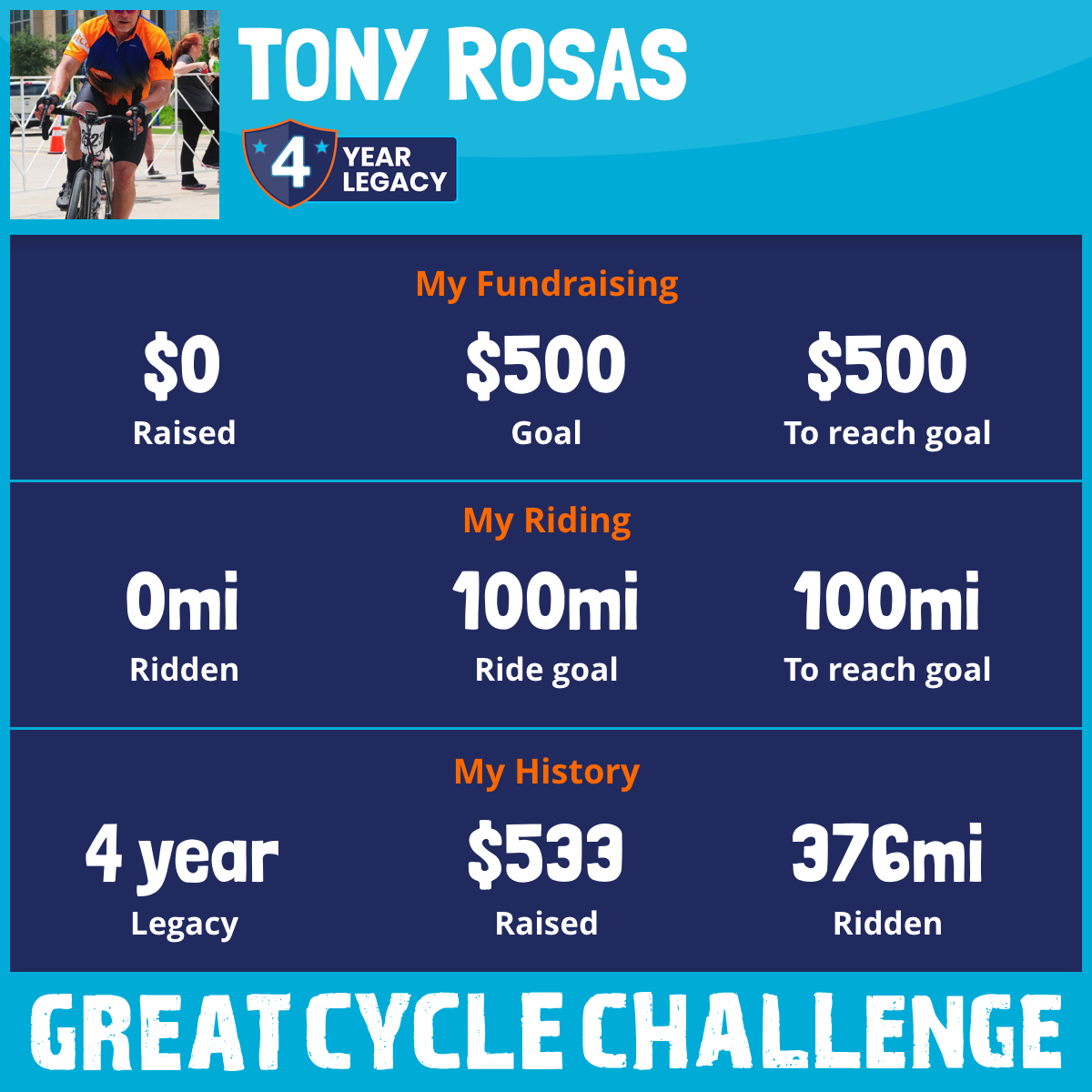I've raised $0 My goal is $500 Donate Now